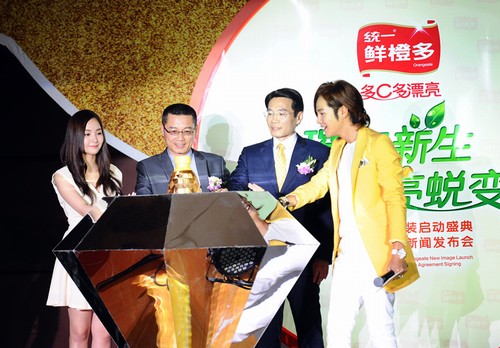 导语:2012年5月31日,我国食品饮料巨子——一致公司集团在北京举办了一致鲜橙多新装发动盛典暨代言人签约新闻发布会,正式摆开一致鲜橙多品牌美丽内在与产品形象的两层晋级大幕。,,(左起)新装露脸—